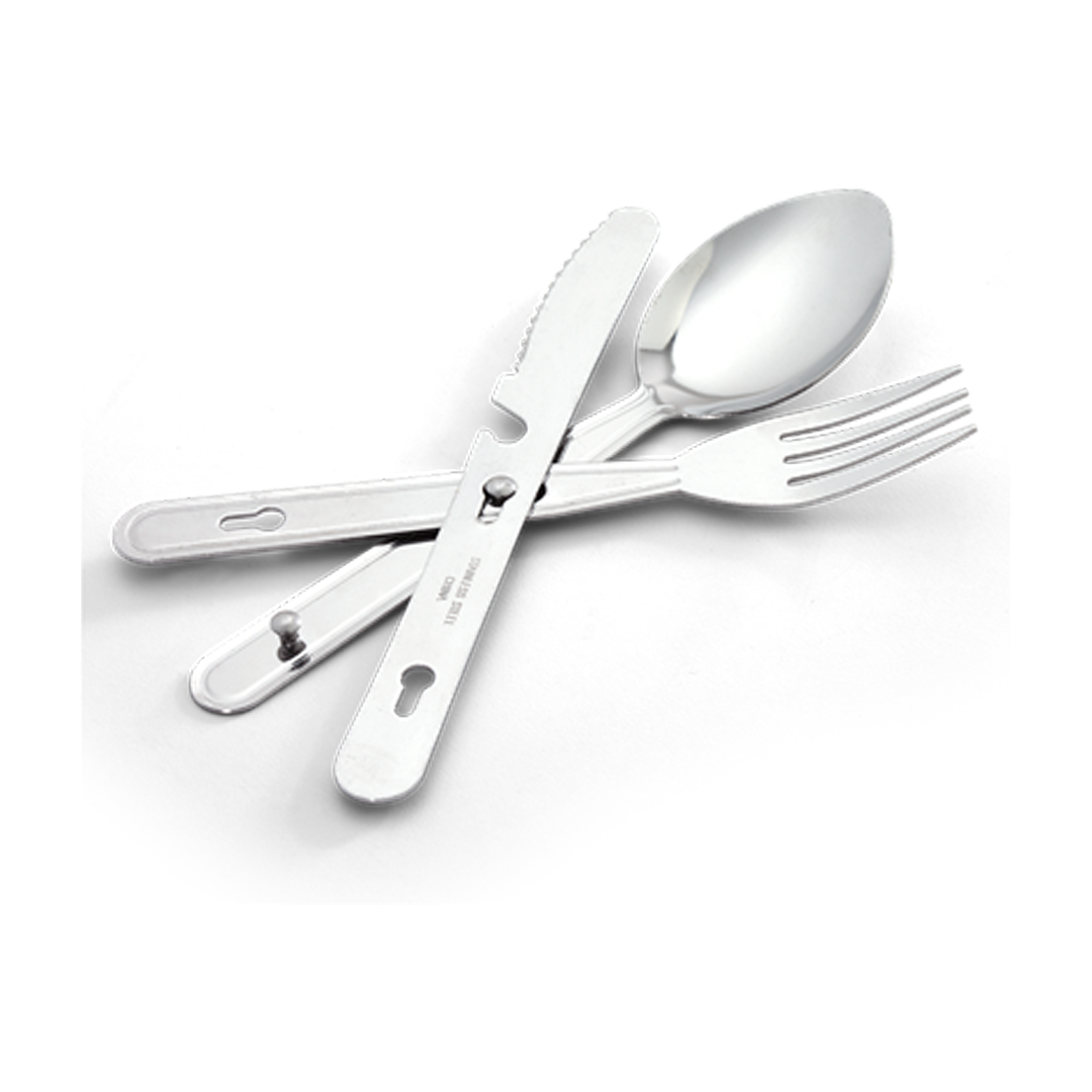 This three piece stainless steel knife, fork and spoon set clip together for easy carrying and storage.